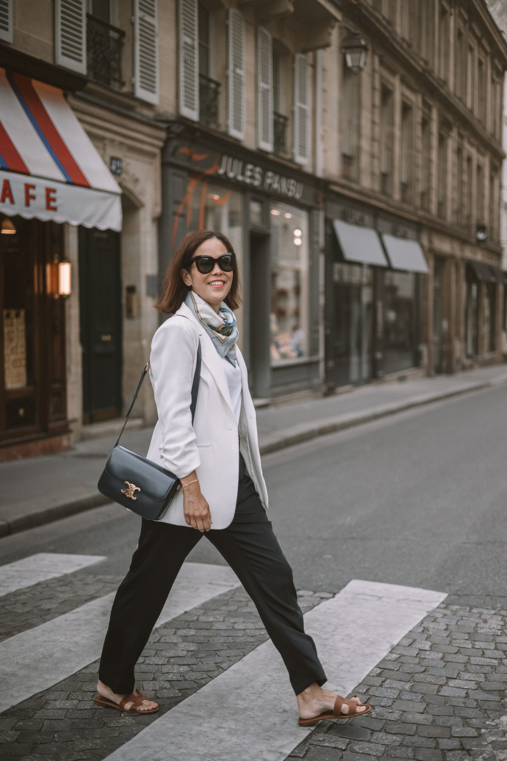 Stick with neutral colors: navy, black, camel, or white, to blend in seamlessly with Parisian style. Some of my favorite blazer options are from SƩzane, Cinq Ɣ Sept, Veronica Beard, and J.Crew.