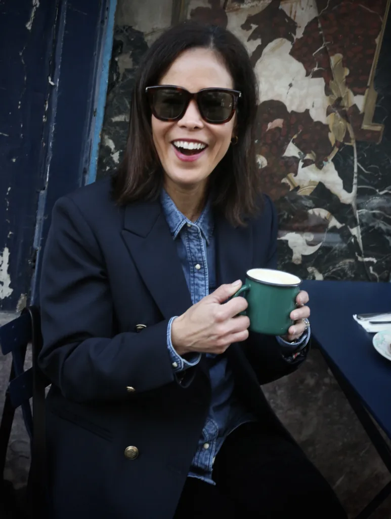 For the days you want to be a bit Parisian, style your navy blazer with a striped top, jeans, and a pair of ballet flats. The gold buttons on the blazer elevate the look a bit but you could also go with a plain navy blazer and look just as chic.