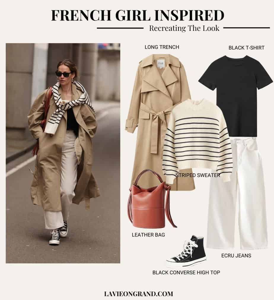 Always a classic and chic combination is putting together a long trench coat with a striped sweater over the shoulders. It’s a relaxed yet polished look that I love to recreate.