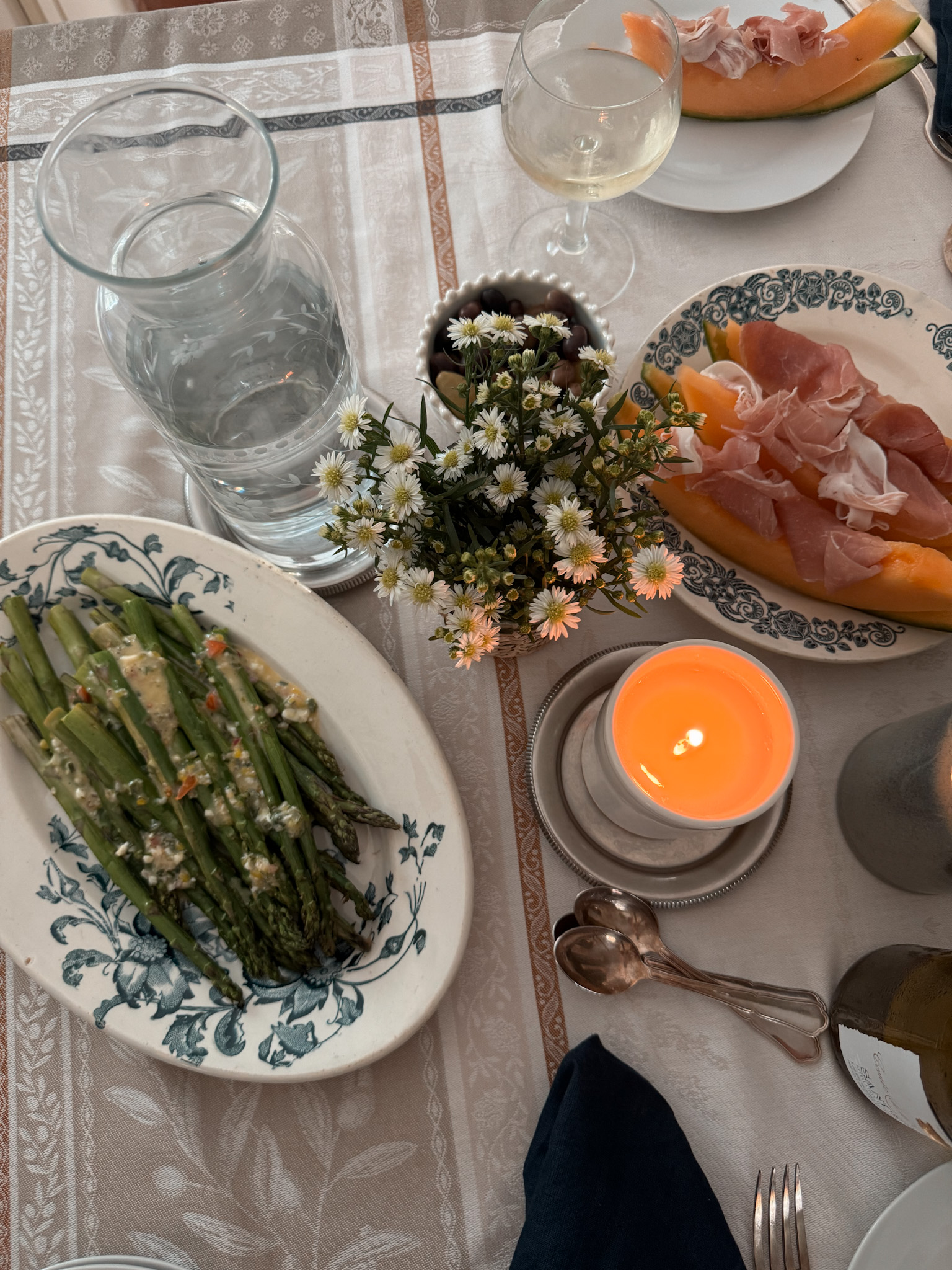 Tablescape showing what to serve at a french apero with wine, asparagus, veggies.