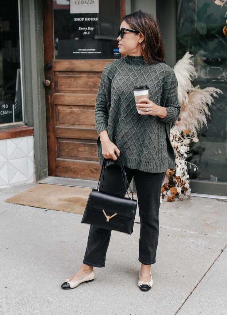 This sweater also has open sides with slits and a drop shoulder which make it super roomy and allows it to fit most sizes. It’s a medium-weight sweater and not heavy at all. It hits me a little below my waist, I am 5′ 5 1/2 for reference.