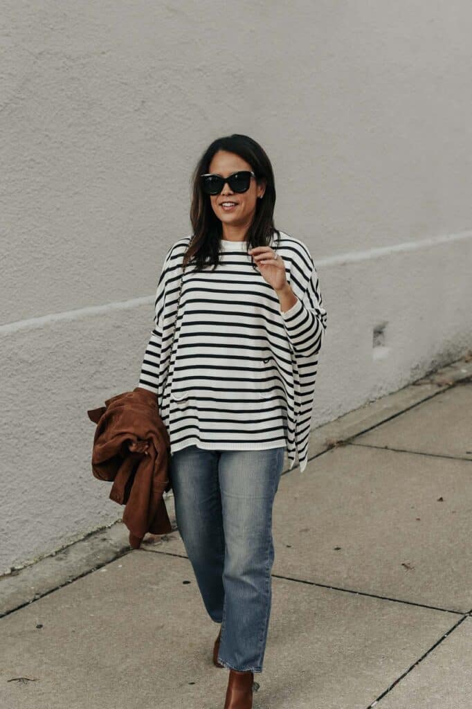 I am wearing the Catalina crewneck in the striped navy, but there are also many solid colors as well. I’ve paired it with straight-leg jeans and boots but you could easily do it with skinny jeans and high boots or under a blazer as well to dress it up.